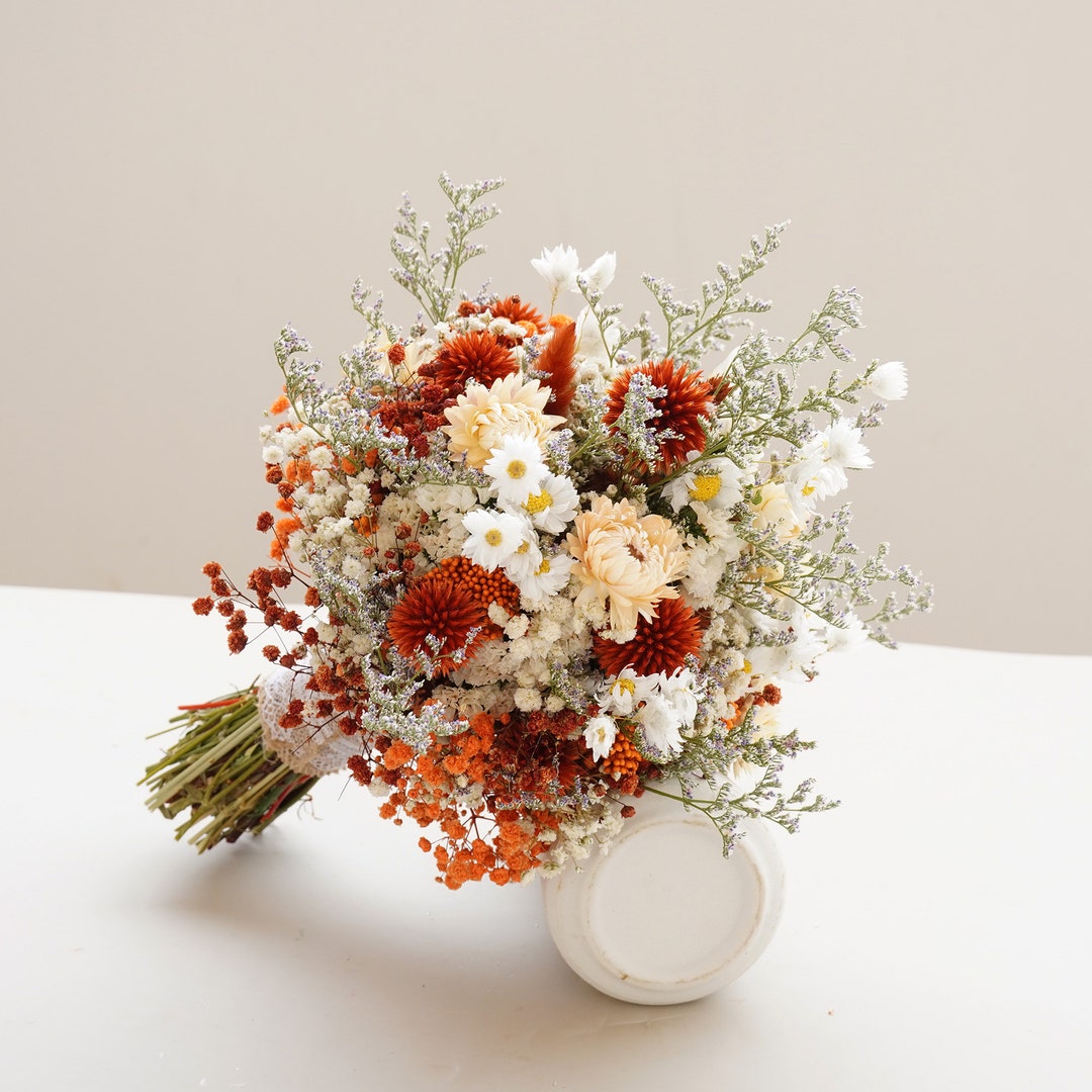 Globe verbrande oranje distel + madeliefje gedroogde bloem bruidsboeket, wilde bloem bruidsboeket, boho bruiloft thema gedroogde bloemen