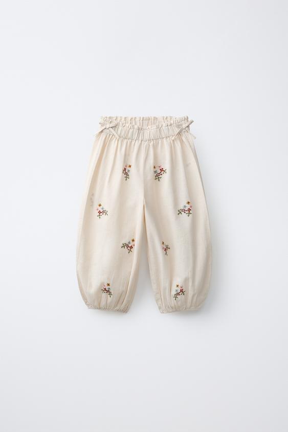 COTTON AND LINEN CROSS-STITCH EMBROIDERED TROUSERS