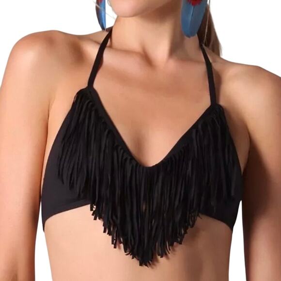 L*Space Audrey Black Fringe Coastal Cowgirl Halter Bikini Top Size Medium