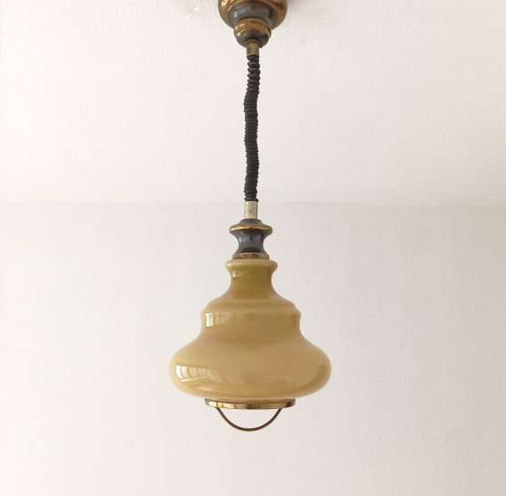 Suspension Mid-Century jaune/moutarde en opaline des années 60, hauteur réglable vers le haut et vers le bas